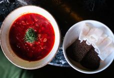 400 г • Сытный и наваристый, яркий и знакомый всем борщ с копченой куриной грудкой, чёрным хлебом и салом