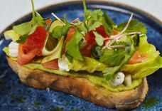 135 г • Слабосоленым лосось со свежим салатом, солоноватыми каперсами и слайсами огурца на домашней булочке, смазанной сливочным муссом и кремом из авокадо