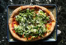 370 г • Сытная пинса с нежным цыпленком, тянущимся сыром и ароматным соусом песто, присыпанная свежей пряной руколой (25 см)