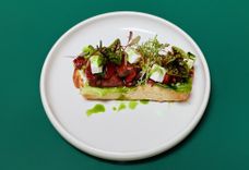 135 г • Лосось слабосоленый, чиабатта светлая, кабачок, крем из авокадо, мусс сливочный с чесноком, каперсы, масло подсолнечное, ромен, масло зеленое, кинза, микрозелень, икра сурими