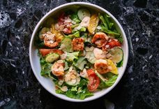 Салат с креветками, соусом спайси, томатами и апельсином