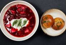 330/90/1 г • Наваристый борщ с ароматным копченым цыпленком и чесночными пампушками